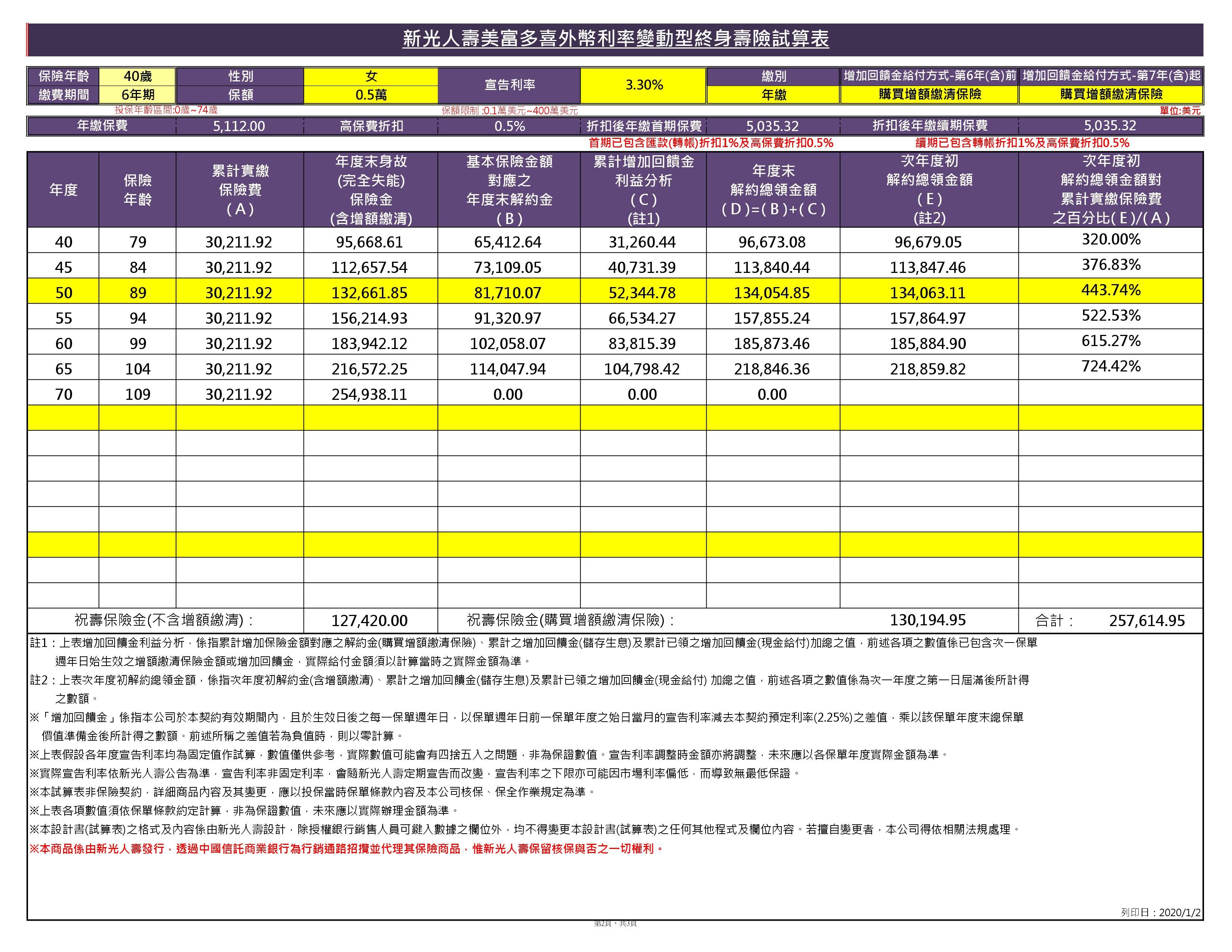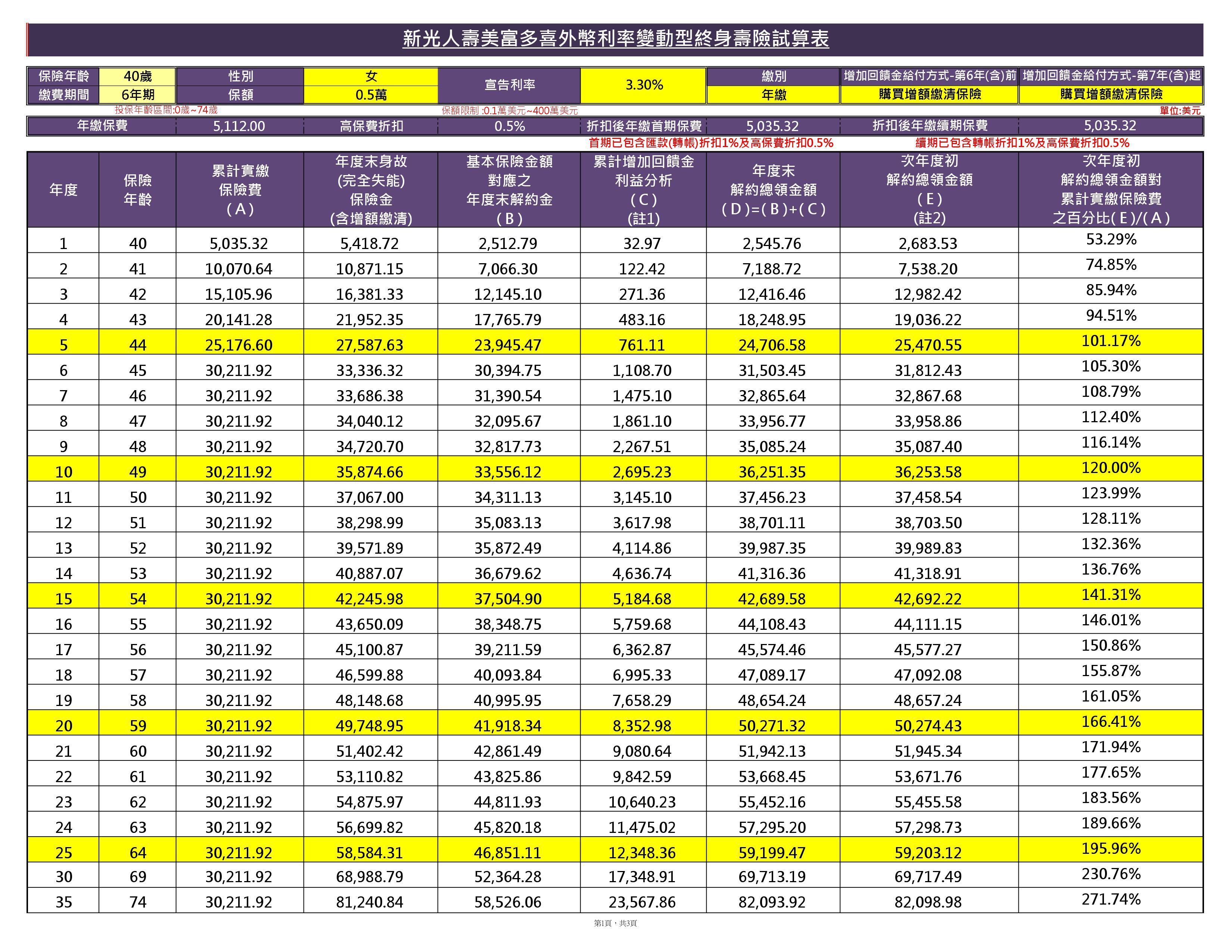以下IRR及總累積報酬率的計算以40歲女選擇投保「新光人壽美富多喜外幣利率變動型終身壽險」,基本保險金額5,000美元,繳費期間6年期,年繳保費5,112美元,享高保費折扣0.5%,首、續期轉帳1%折扣,折扣後年繳首期保費為5,035.32美元,增加回饋金給付方式皆為「購買增額繳清保險」