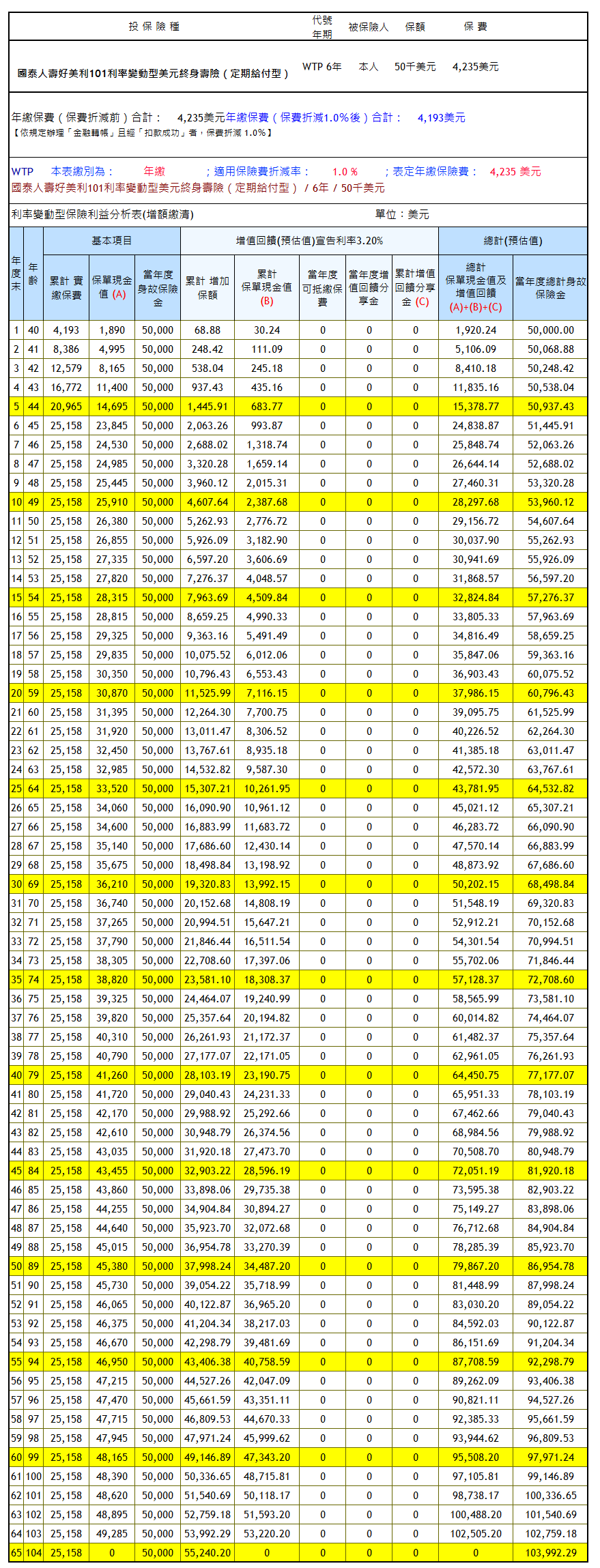 以40歳富小姐為例,投保【國泰人壽好美利101利率變動型美元終身壽險(定期給付型】,繳費6年期,保額50千美元 ,表定年繳保險費 4,235美元 ,加計自動轉帳1%折減後為 4,193美元,增值回饋分享金選擇增購保額