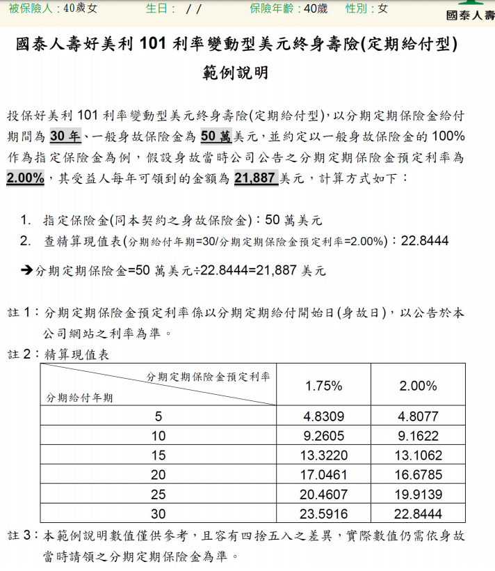 國泰人壽好美利101利率變動型美元終身壽險也是定期給付型,係指身故的保險金可一次全部給受益或分期給付給受益人,分期給付方式:分5、10、15、20、25、30年,按年給付方式給付