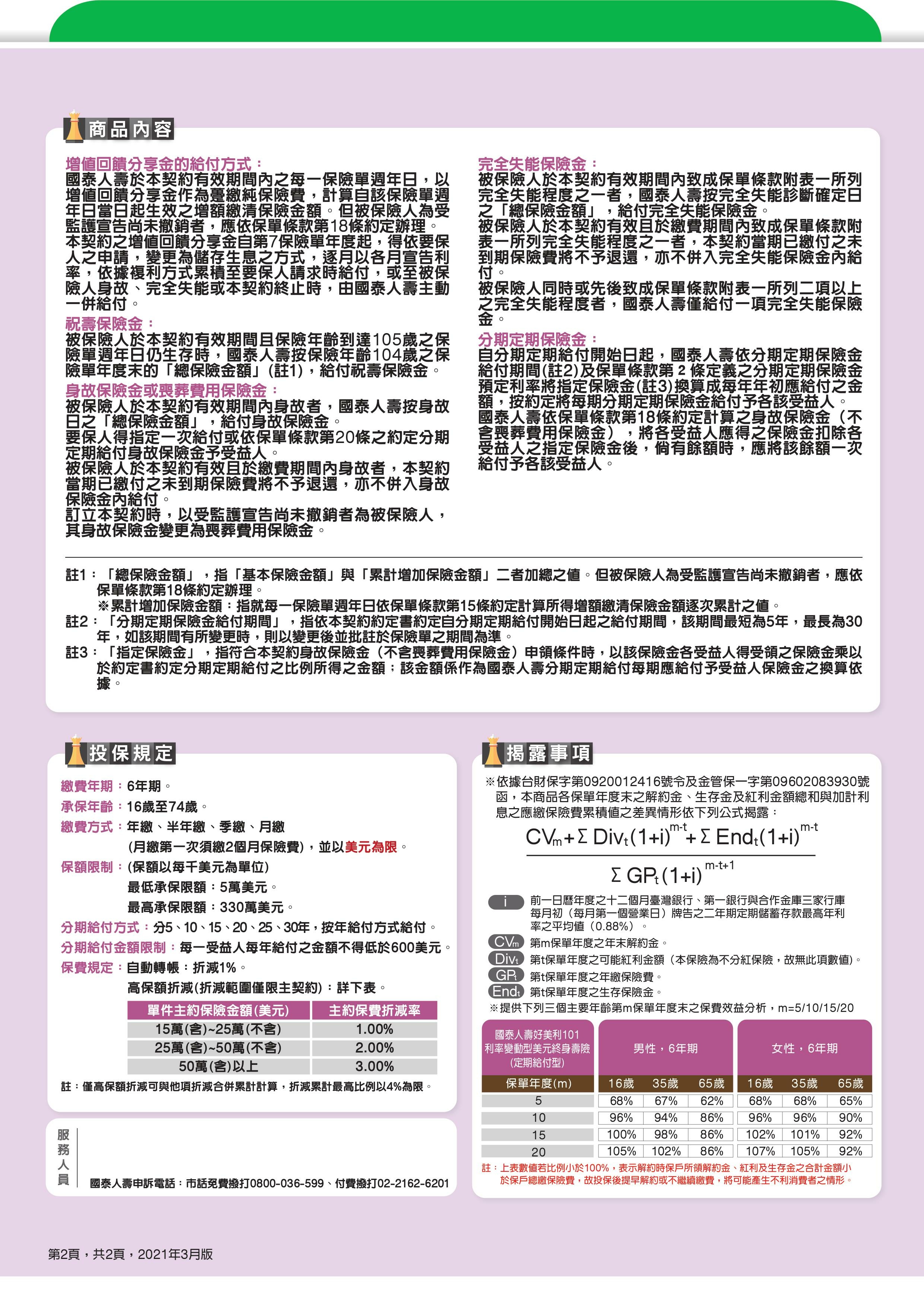 (3) 保障功能:依保費折扣高低不同,第6年末以後身故⇉1元的保費約可得到2.05元(含1%保費折扣)~2.11元(含4%保費折扣)以上的身故保險金