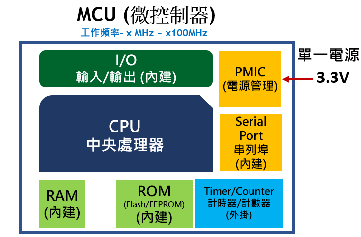 MCU另一個重要的優點只要只需要單一電壓大小的電源供應,如3.3V。