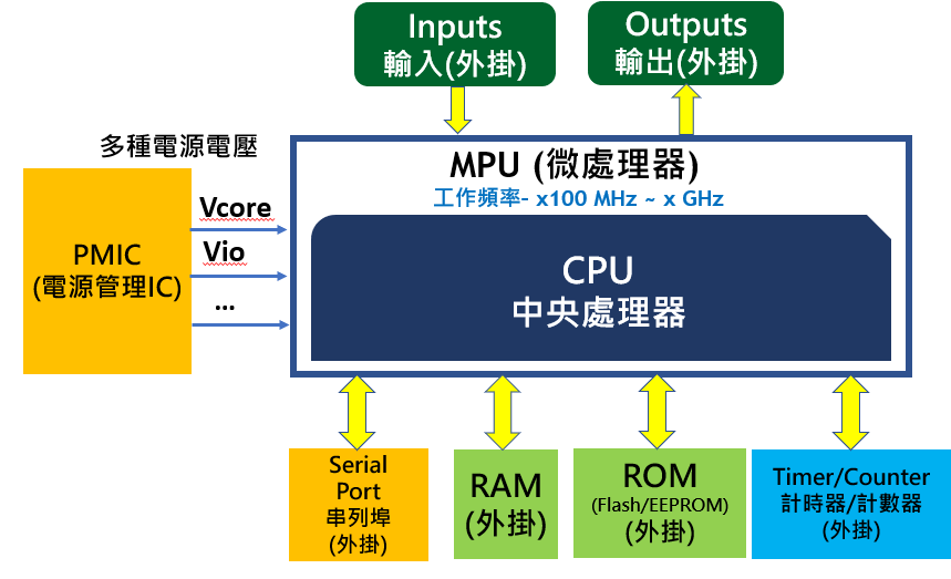 MPU (Micro-processor Unit)的中文是微處理器,MPU 通常沒有內建的記憶體( Flash或 RAM),使用外部記憶體來儲存資料及運行程式。程序碼通常儲存Flash中,並在啟動時把程式碼搬動到到外部 DRAM 中,然後開始執行。這意味著 MPU 無法像 MCU 那樣可以快速啟動和執行程式,但是優點連接到處理器的 外接DRAM 和Flash的大小可以在幾百MB~ GB的範圍。在電源供應的要求上,MCU 只需要一個單一的電壓電源,但MPU 則需要多個用於內核、DDR 等的不同電源電壓。開發人員通常在系統電路板上加入額外的電源 IC/轉換器來滿足這一要求。